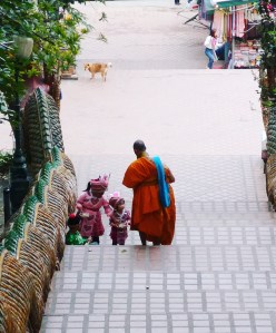 Bevor wir diesen wunderbaren Ort verlassen, sehen wir den morgendlichen Almosengang der Mönche. Dabei spenden Gläubige Speisen, Geld und Nützliches wie Zahnpasta. Inzwischen gibt es Almosenpakete im Supermarkt zu kaufen. Als wir die Naga-Treppe wieder hinunter gehen, sind zwei Mönche vor uns, die drei Kindern am Fuss der Treppe Kekse aus ihren Almosenbehältern geben.