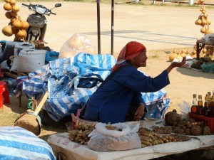 Hier sehen wir am Markt alte Frauen, die uns mit roten Zähnen zulächeln. Das kommt vom Betelnusskauen, was man im fortschrittlichen Thailand nur noch sehr selten sieht. Eine Dame bietet uns eine Betelnuss an. Äh, No thank you. Unreife Betelnüsse werden in vielen asiatischen Ländern zerkleinert und zusammen mit gelöschtem Kalk und Betelpfeffer-Blättern angeboten. Das Kauen soll einen rauschartigen Zustand hervorrufen inklusive blutroter Zähne und Lippen.
