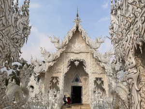 Ein neueres Wahrzeichen Chiang Rais ist der leicht kitschige Wat Rong Khun, der White Tempel. Das monumentale Werk eines Künstlers, das 1997 erbaut wurde und noch lange nicht beendet ist. Der Künstler selbst steht winkend als Pappfigur am Eingang des White Temple. Im Jahr 2070 soll der Bau beendet sein, bisher sind 20% fertiggestellt. Unglaublich. Wir hatten Glück, als wir in der Früh da waren, war nichts los. Der White Temple ist normalerweise überfüllt mit Tagestouristen aus Chiang Mai.